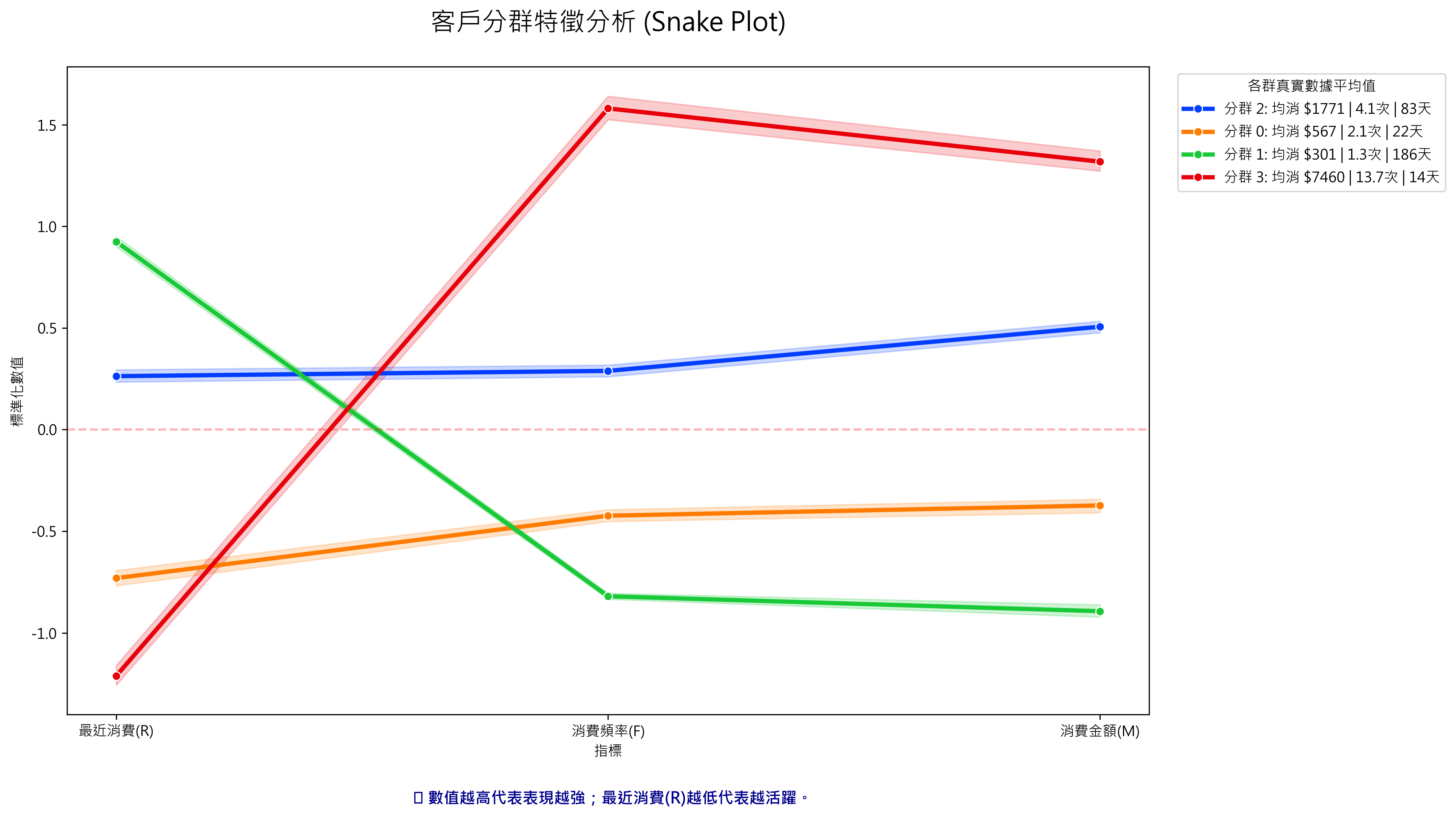 透過蛇形圖,我們可以直觀觀察各分群在 R、F、M 三個維度的強弱表現:
